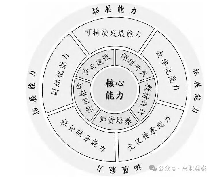 职业学校关键办学能力是一个在办学实践中产生的概念,主要是指对职业学校办学能级提升起直接、关键作用的要素的建设水平和实践成效。基于组织效能理论,有学者将其定义为职业学校获取资源实现系统目标,达到政府、职业院校、学生、社会等多主体利益协调统一的可持续发展能力,体现为普通办学能力群中的核心能力,这些要素决定了职业学校达到系统目标的程度。而基于产教融合视角,依据《高等职业学校办学能力评价实施方案(2025—2030年)》中“聚焦专业、课程、教材、师资、实习实训等教学关键要素”的政策要求,以及《教育强国建设规划纲要(2024—2035年)》中关于构建终身学习制度、推进教育数字化、培育能工巧匠与大国工匠、增强教育与经济社会发展适配能力等战略导向,构建“核心—拓展”双维能力框架(图1)。在此框架下,将职业学校关键办学能力定义为:职业学校以校企深度协同为驱动引擎,在专业建设、课程开发、教材设计、师资培养、实训条件等办学要素上形成核心能力,并在此基础上构建数字化、国际化、社会服务等拓展能力,从而持续培养契合产业需求的高素质技术技能人才,有效服务产业转型升级和区域经济高质量发展的综合性能力体系。核心能力构成办学质量保障的根基,具有稳定性和标准化特征;拓展能力则面向未来发展需求,具有前瞻性和动态性特征。二者相互支撑、协同发展,既保障技术技能人才培养的即时适应性,又培育其可持续发展潜力,最终实现职业教育培养高素质技术技能人才和服务经济社会发展的双重使命。